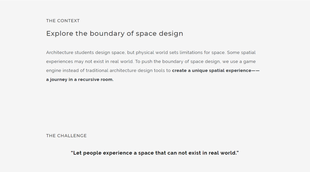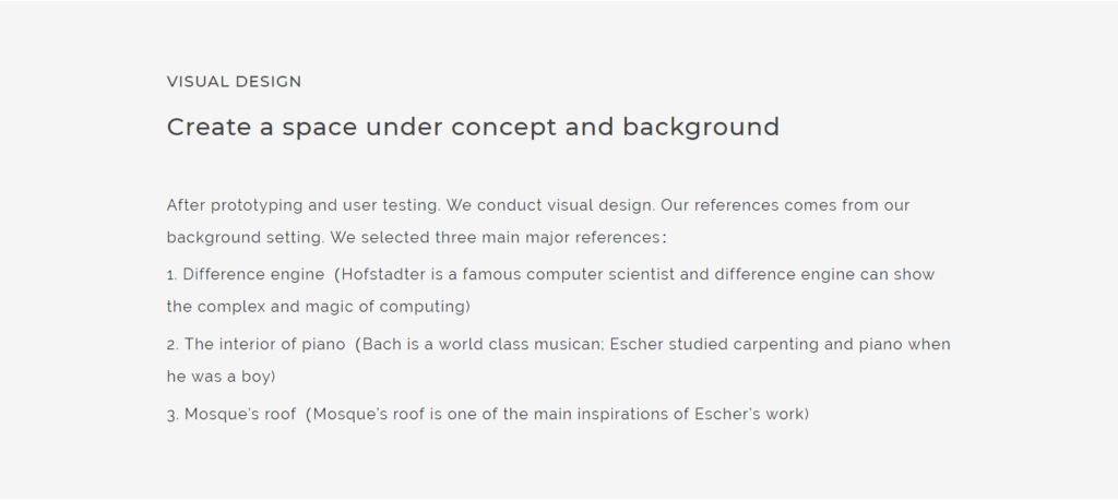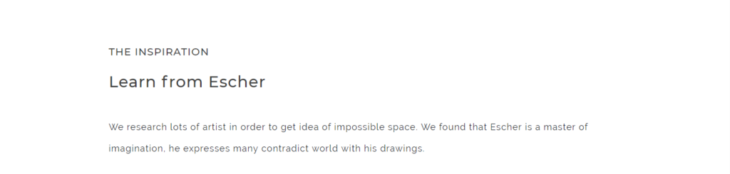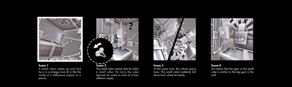 Game Design Escher's BoxUse design to illustrate an impossible space story PROJECT INFORMATIONCategory: Game DesignMy Role:Visual Design, Modeling,Concept design(with Wen & Derek), coding (with Wei)Timeline: 8 weeks MoodBoard Coding First player view game play Thanks for watching