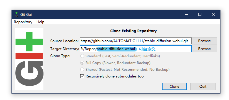 若新建的文件夹为 F:/Repos, 则Target Dictionary为 F:/Repos/stable-diffusion-webui