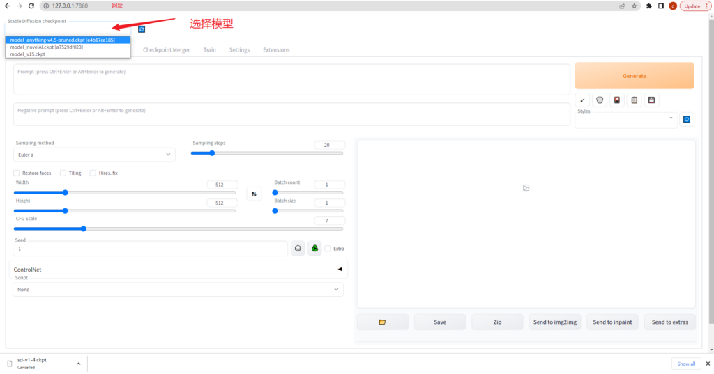 将cmd中的网页复制粘贴入浏览器即可使用,网页左上角加载下载好的模型,开始体验Stable Diffusion
