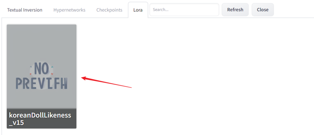 2.选择Lora模型,若没有出现防止进去的模型请点击Refresh